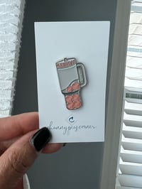 If Stanley Cups and Yarn are your favorites then you will love this moody gray and peach Enamel Pin.